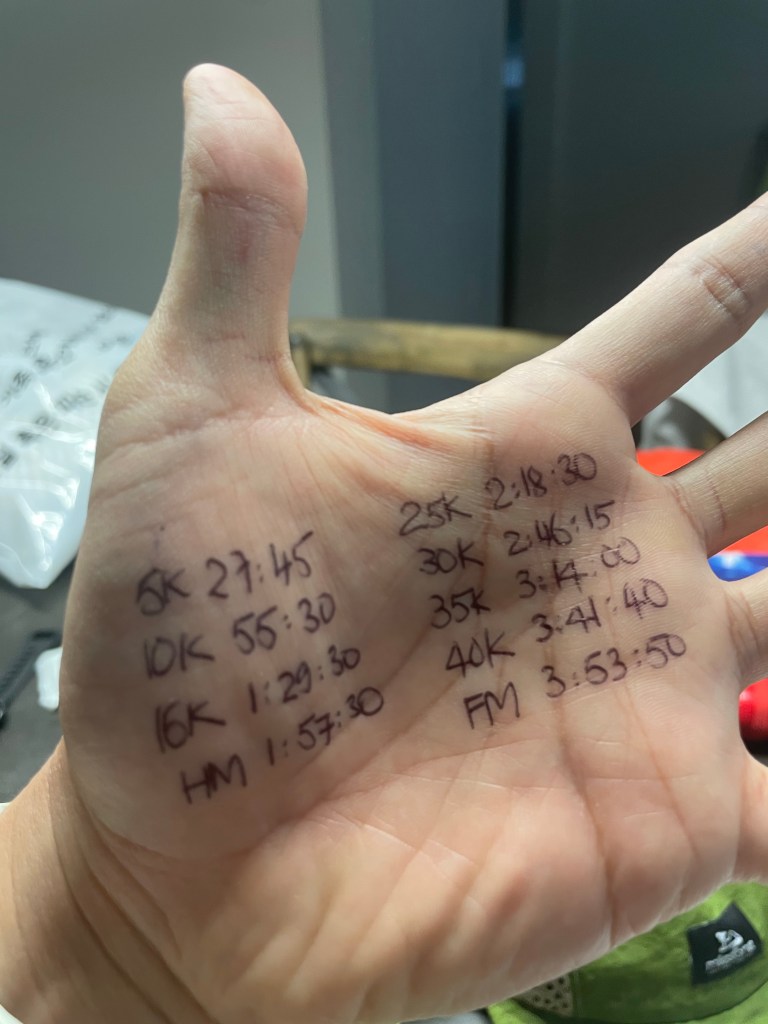 - Gears (bottom to top): Saucony Endorphin Pro 2, T8 socks, 2XU compression long tights, T8 sherpa running shorts, Rabbit racing vest, innov-8 stormshell jacket, Decathlon running arm sleeves, neck warmer cloth, contact lenses, sunglasses and running hat.